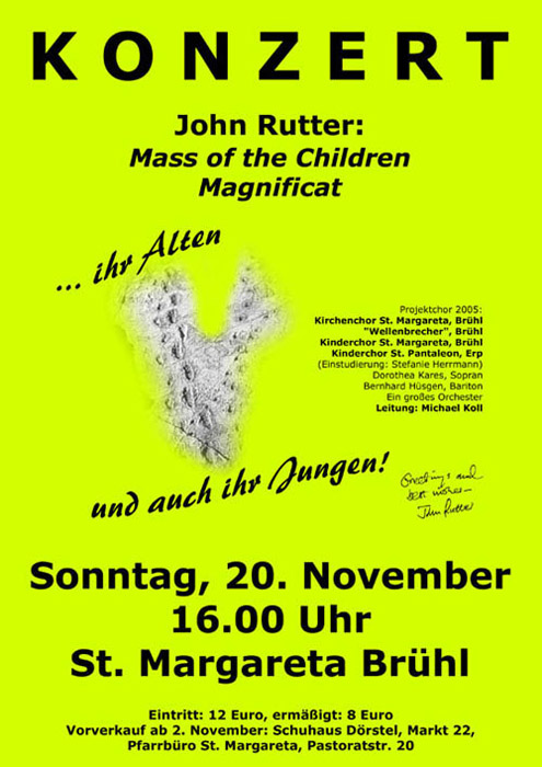 Es erklangen zwei Werke des englischen Komponisten John Rutter: Die „Mass of the Children“, und das „Magnificat“. Bereits mehrfach führten die Brühler Chöre unter der Leitung von Regionalkantor Michael Koll und seit 2011 unter seinem Nachfolger, dem aktuellen Kantor an St. Margareta, Peter J. Klasen, Werke des 1945 geborenen Komponisten auf. Das Besondere an diesem Chorkonzert war, dass hier die Kinderchöre gemeinsam mit den „großen“ Chören eine beeindruckende Stimmenvielfalt zu Gehör brachten.
