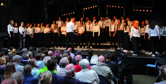 „Wir haben in diesem Jahr auch einen Videogruß von Kammerton erhalten, der in einem Bunker aufgenommen wurde. Sie haben in ihren Choroutfis ein Lied auf Deutsch gesungen. Das war für uns sehr bewegend, gerade weil wir uns auch persönlich kennen“, sagt Paula Cloidt. Diese Partnerschaft wurde offiziell gemeinsam mit Bürgermeister Dieter Freytag im Rahmen der Brühler Liedertafel besiegelt. Gemeinsam sendete der Chor mit Bürgermeister und Publikum einen Videogruß in die Ukraine. Der Brühler Chor probt jeden Montagabend von 18:45 bis 20:45 Uhr im Atrium des St.- Ursula-Gymnasiums. Anfang 2026 wird der Chor ein Vorsingen veranstalten. „Wer gerne in einem Chor singt und Lust auf eine bunte Truppe hat, kann dann gerne bei uns vorbeischauen“, meint Isabel Tondorf.