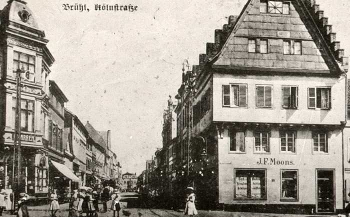 Ob man den Begriff „schwarzer Tag“ tatsächlich auf den Rauch und Ruß eines Brandes zurückführen kann, sei dahingestellt. Einen solchen schwarzen Tag jedoch erlebte Brühl am 15. September des Jahres 1530: ein verheerender Stadtbrand färbte den Himmel über dem kleinen Städtchen zunächst rot und legte im Verlaufe weniger Stunden beinahe die gesamte Stadt in Schutt oder eher fast nur Asche. Denn Steinbauten waren sehr selten. Lediglich einige wenige Häuser überstanden diese Feuersbrunst, ansonsten entstand Brühl nach diesem Datum quasi völlig neu. Einer der wenigen Zeugen der Zeit „davor“ ist das große Haus zum Stern (ehemals Haus Moons), das dem Brühler Markt seinen eindrucksvollen Abschluss nach Norden hinbietet. Dem Archiv des Brühler Ehrenbürgers Fritz Wündisch ist zu entnehmen, dass das Haus etwa um das Jahr 1525 herum vom damaligen kurfürstlichen Oberkellner (Kämmerer) Wilhelm Kannegießer erbaut wurde.