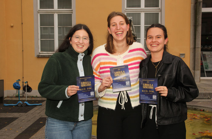 Es soll ein großes Konzert in diesem Jahr werden, das Adventskonzert der Ursula Singers. Anders als bei den meisten anderen Auftritten wird der A-Capella-Chor diesmal bei einzelnen Stücken von einer Band begleitet. Das Programm wird wieder weihnachtlich sein und viel Abwechslung bieten. „Wir werden Stücke dabei haben, in denen wir Pop und Jazz miteinander kombinieren“, berichtet Paula Cloidt, die Vorsitzende der inzwischen als Verein eingetragenen Ursula Singers. Präsentiert werden neu arrangierte Weihnachtsstücke wie „Santa Claus coming to Town“ in einer Latin Version. Es wird wieder Soloparts geben, auch sind verschiedene Dirigenten zu erleben. Die Songs stammen von Billy Joel über Queen, Chicago und Coldplay bis hin zu Billie Eilish. Bekannte Klassiker treffen auf moderne Pop-Perlen – alles mit Leidenschaft, Humor und Herz arrangiert. Es wird richtig was los sein auf der Bühne. „Zu unserem Erfolgsrezept gehört, dass wir bei unseren Konzerten wild innerhalb der Genres wechseln“, meint Isabel Tondorf, eine der über 40 aktiven Sängerinnen und Sänger des jungen, gemischten Chores, dessen Mitglieder im Alter zwischen 15 und 30 Jahren sind.