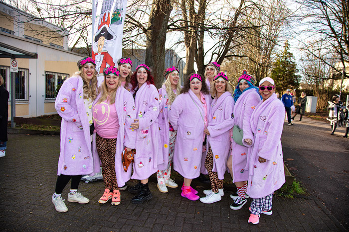 Wir sind in diesem Jahr die Pyjama Girls aus Brühl und suchen uns immer neue Kostüme aus. Wir haben online auf Pinterest nach Ideen gesucht und fanden die Pyjamas eine tolle Idee. Wir sind eine große Gruppe und haben eine Sammelbestellung aufgegeben. Und auf die Kostüme haben wir dann Sticker aufgebügelt.