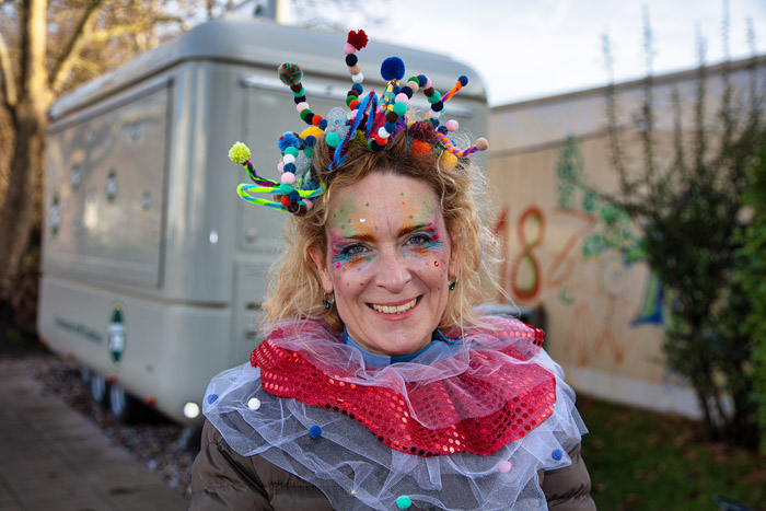 Wir sind Pantomimen. Das Kostüm war noch in meinem Schrank. Weil meine Tochter im Karnevalsverein ist, mache ich auch mit, obwohl ich mich auf einer Skala von 1 bis 10 eher bei der 1 in Sachen Karnevalsbegeisterung ansiedle. Aber die Sitzungen machen schon Spaß.