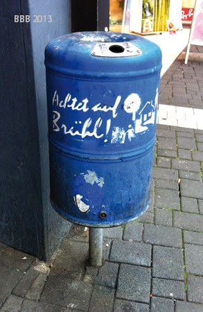 Besonders jetzt in der Ferienzeit werden diese Brühler Mülleimer bei Touristen aufgrund ihrer subtilen Botschaft für Verwirrung und Erstaunen sorgen. Dieser befindet sich direkt am Markt im Herzen unserer Innenstadt.