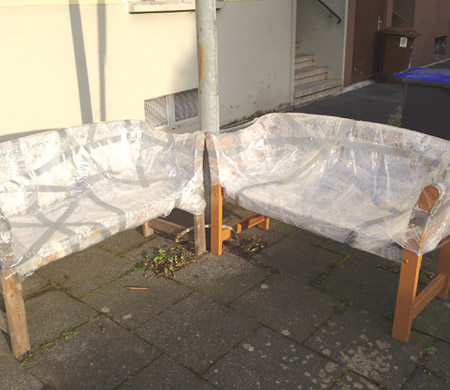 Seltsam eingewickelte Bänke präsentieren sich vor dem Atelier der Brühler Künstlerin Gabriele Vorbrodt in der Hermannstraße 36. Letztes Jahr stand dort ein großer Weihnachtsbaum den alle mitschmücken durften. Was hat es aber mit diesem „Bankenwesen“ auf sich? Sie nennt es das „Bankgeheimnis“. Wie es jedoch nun mal der Gesetzgeber vorsieht, wird auch dieses Bankgeheimnis aufgebrochen werden.